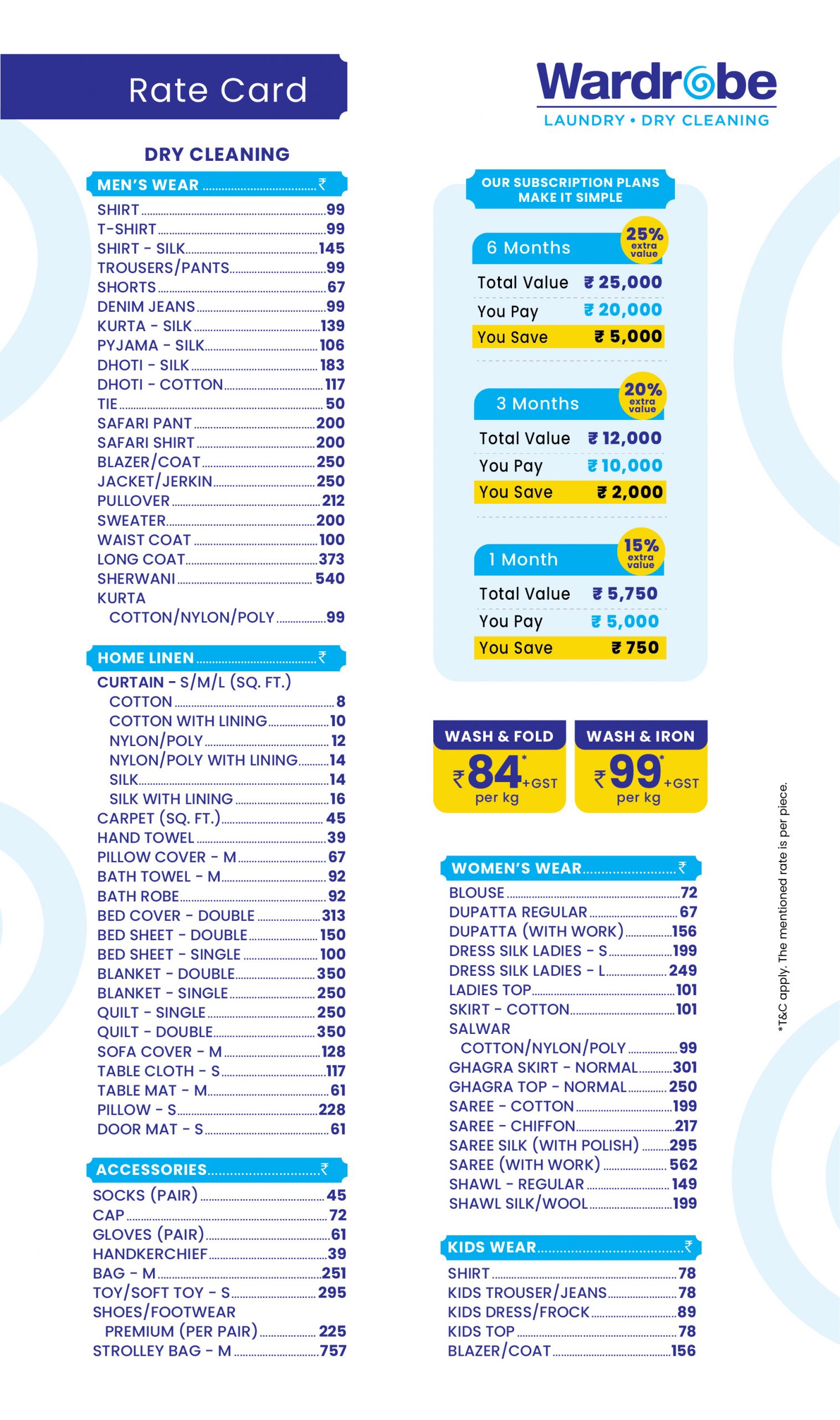 Wardrobe offers affordable laundry pricing, depending on the service and fabric type. Our laundry plans start at affordable rates on a per kg basis, while premium dry cleaning services are priced per garment. Click to View Rate Card